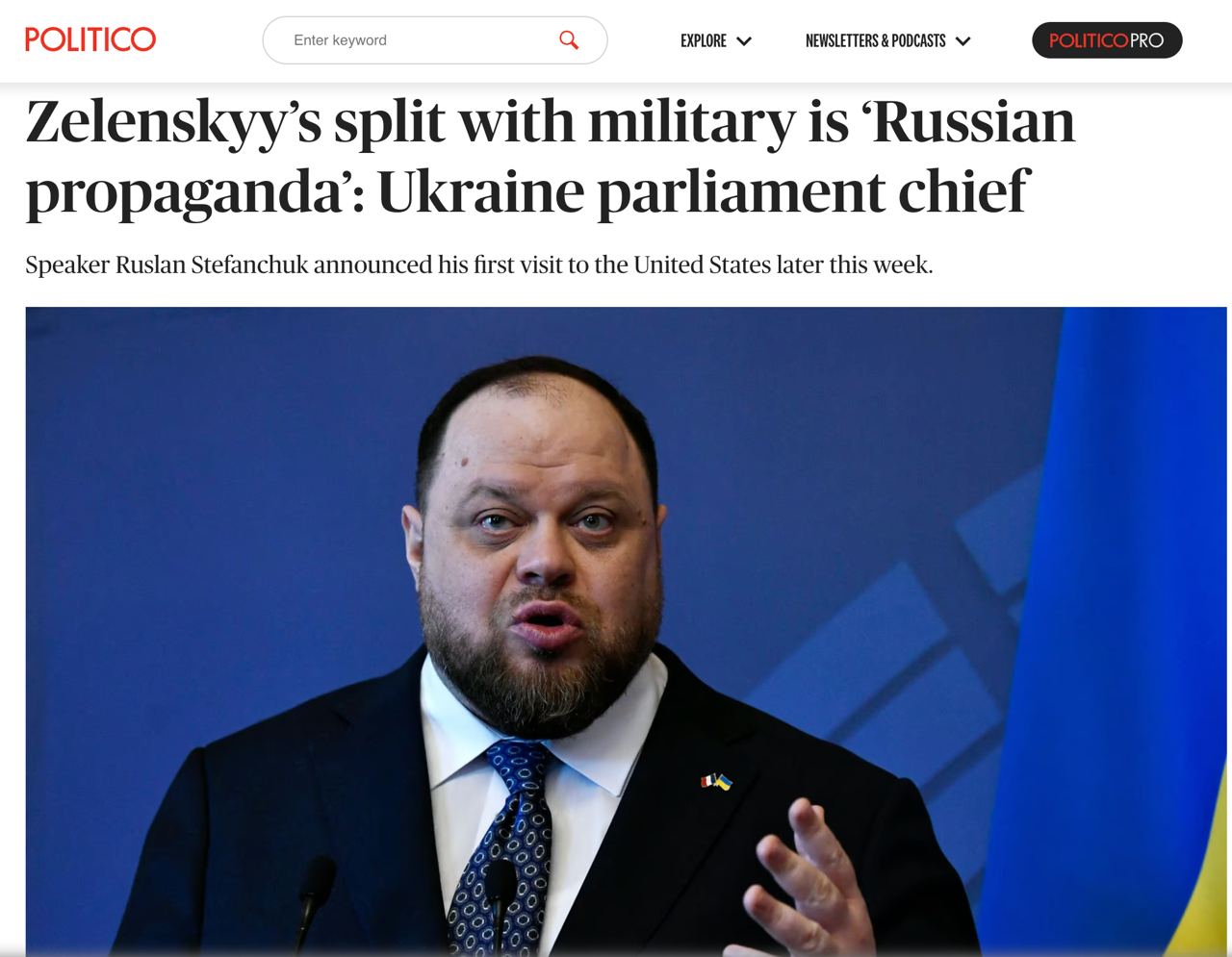 Спикер парламента Руслан Стефанчук отрицает конфликт президента Украины Владимира Зеленского и главкома ВСУ Валерия Залужного.