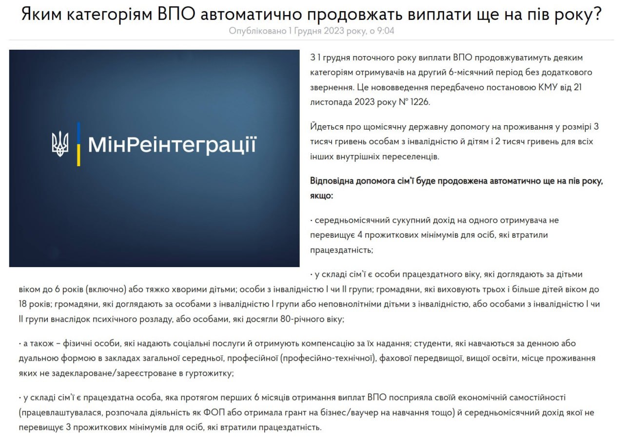 Такое решение принял Кабмин, о нем сказано в постановлении №1226, сообщает сегодня Минреинтеграции.