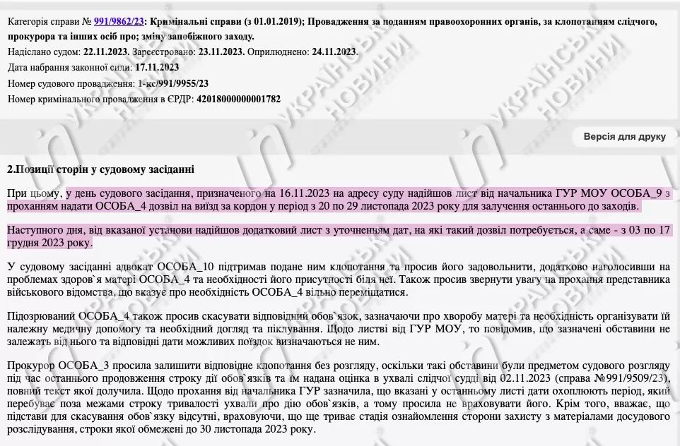 16 ноября суд получил от Буданова письмо с просьбой разрешить Коболеву выехать из Украины в период с 20 по 29 ноября 2023 года. На следующий день от ГУР поступило дополнительное письмо с уточнением дат: 3-17 декабря.