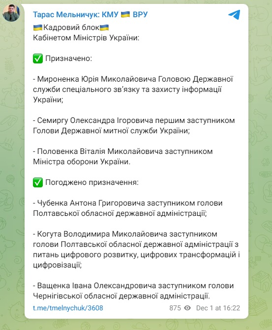 Об этом сообщил в своем телеграм-канале представитель правительства в Верховной Раде Тарас Мельничук.
