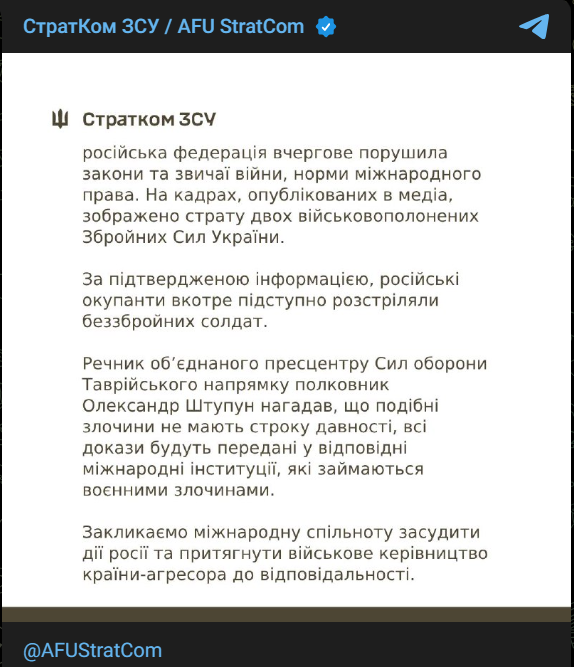 "Убийство военнопленных является грубым нарушением Женевских конвенций и квалифицируется как тяжкое международное преступление", - говорится в сообщении.