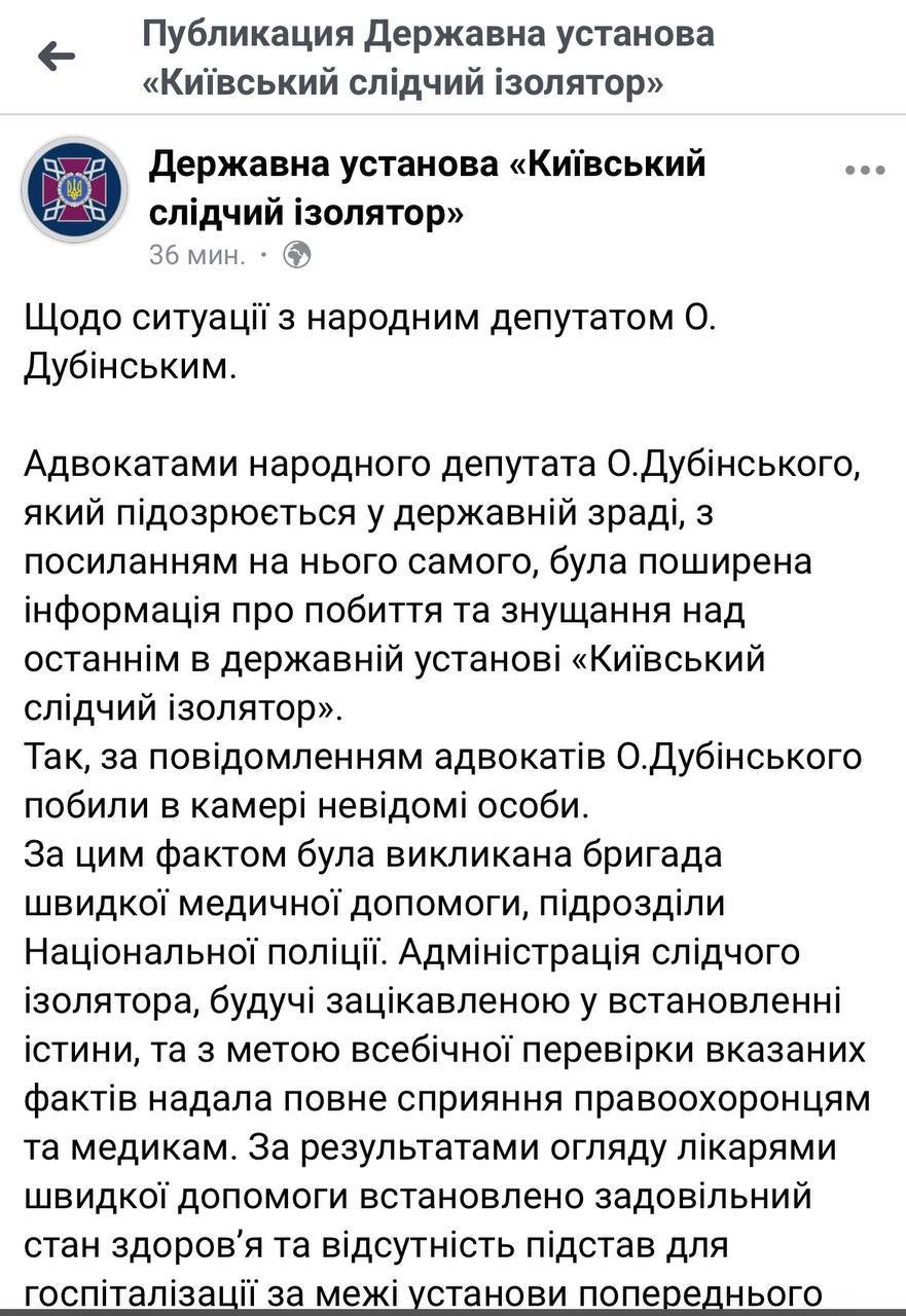 "Сегодня полиция выпускает новость о том, что подтверждения избиениям нет. Судебно-медицинское исследование (экспертиза) с Дубинским не проводилась, поскольку Дубинского не разрешили вывезти из СИЗО. Если в Украине в условиях диктатуры не находят подтверждение пыткам народного депутата в СИЗО - найдут не в Украине", - заявляют адвокаты.