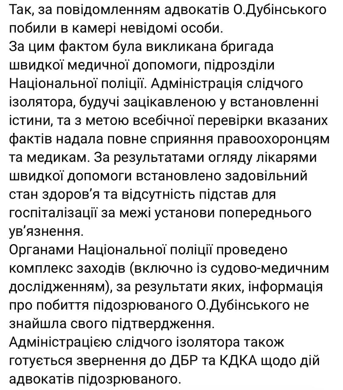 Также Лукьяновский СИЗО вслед за полицией утверждает, что Дубинского в камере не избивали.