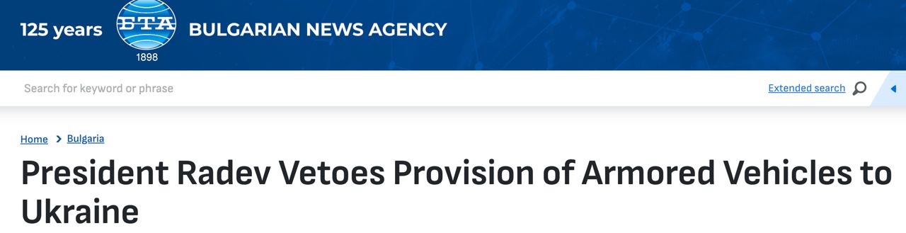 11.10 Президент Болгарии Румен Радев наложил вето на уже ратифицированное соглашение о безвозмездной поставке Украине 100 поддержанных бронетранспортеров, сообщают местные СМИ.