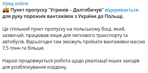 Также спикер Госпогранслужбы Андрей Демченко в эфире телемарафона сообщил, что с 01:00 4 декабря на пункте пропуска "Угринов - Долгобычев" началось оформление грузовиков весом более 7,5 тонны, которые проходят через границу пустые на выезд из Украины в Польшу.