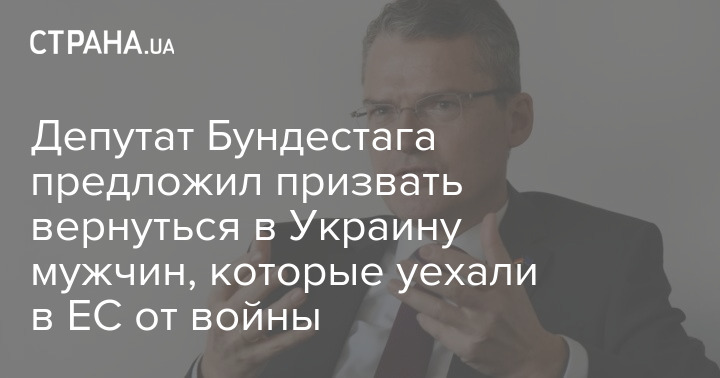 Депутат Бундестага Родерих Кизеветтер (ХДС) высказал мнение, что Евросоюз должен призвать украинских мужчин, которые уехали за границу от войны, поскольку они должны вернуться на родину для помощи на фронте и в тылу.