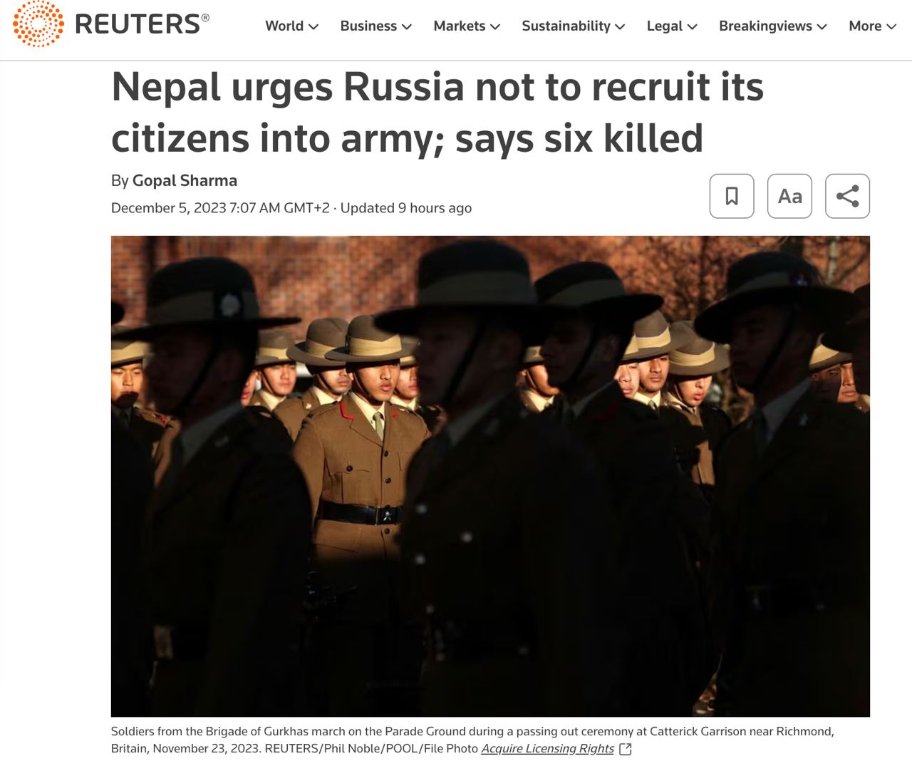 Власти Непала уже призвали Россию не вербовать своих граждан на войну в Украину и отправить всех ранее завербованных домой. В Украине, по данным непальских властей, погибли уже шестеро граждан Непала.
