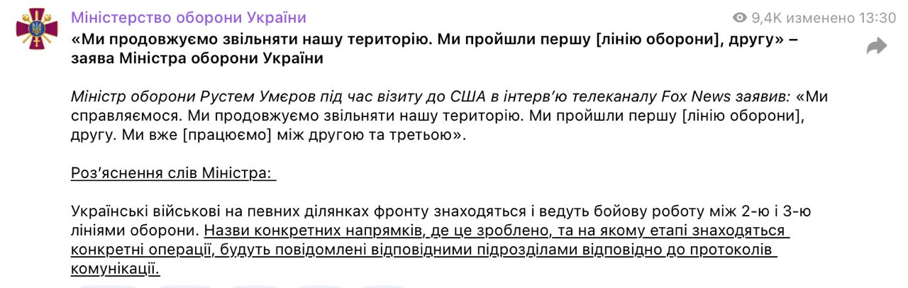 Министерство обороны разъяснило слова своего главы Рустема Умерова о том, что ВСУ прошли первую и вторую линии российской обороны и уже работают между второй и третьей.