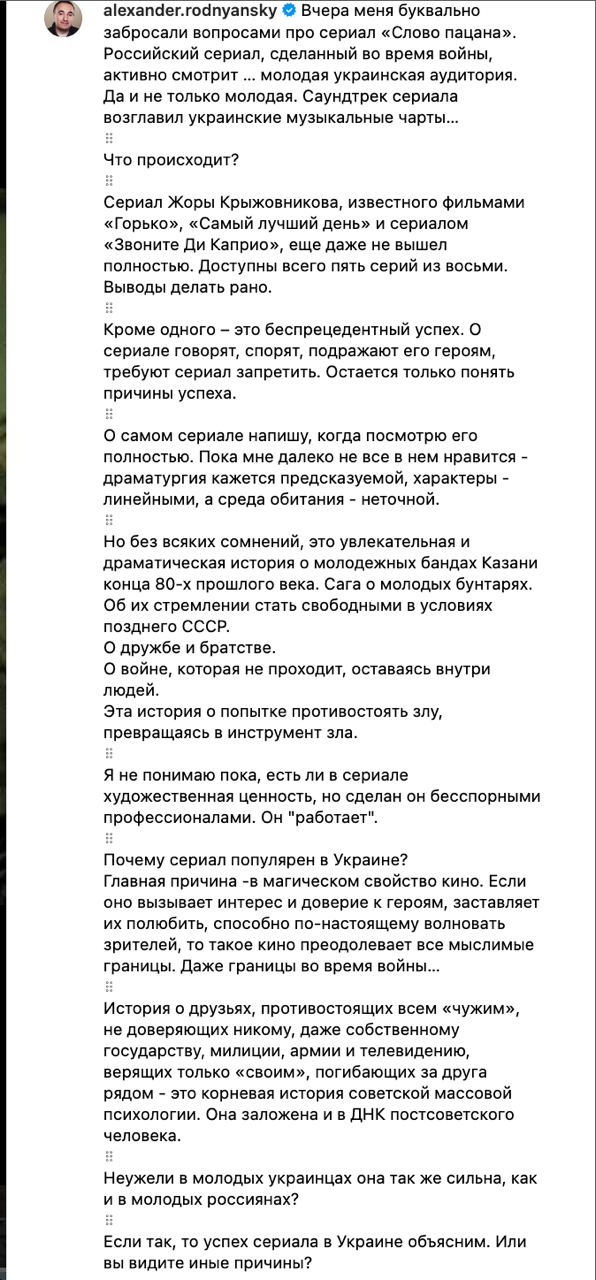 Украинский кино- и телепродюсер Александр Роднянский анализирует причины неожиданного успеха российского сериала "Слово пацана" в Украине.