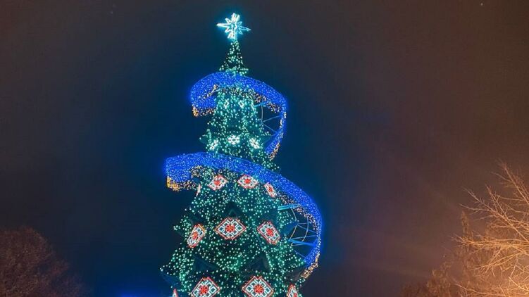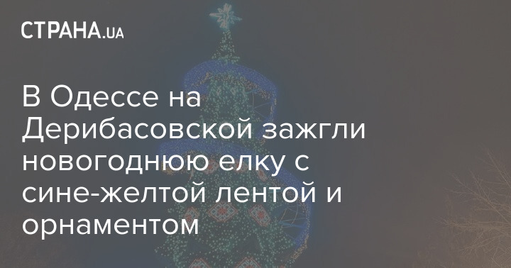 В Одессе на Дерибасовской зажгли новогоднюю елку с сине-желтой лентой и орнаментом