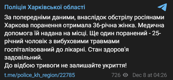 В результате обстрела россиянами Харькова ранения получила 36-летняя женщина. Медицинская помощь ей ​​оказана на месте. Еще один раненый - 25-летний мужчина со взрывными травмами госпитализирован в больницу. Состояние здоровья удовлетворительное.