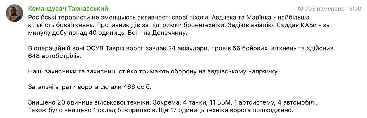 13:08 Армия РФ за минувшие сутки сбросила более 40 авиабомб в Донецкой области, сообщает командующий Александр  Тарнавский.