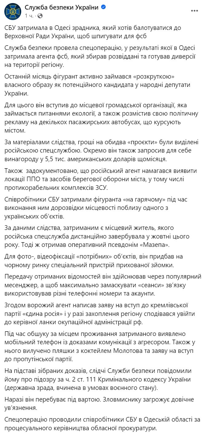 Служба безопасности Украины задержала в Одессе российского агента, который последний месяц вёл политическую кампанию для избрания в Верховную Раду.
