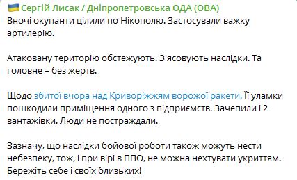 08.10 Обломки сбитой вчера над Кривым Рогом ракеты повредили одно из предприятий.