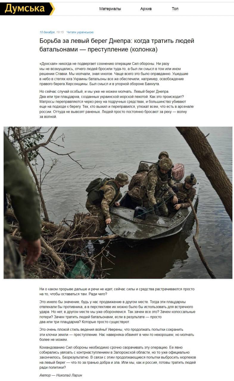 21.55 Операция ВСУ по удержанию плацдарма на левом берегу Днепра лишена смысла и приводит лишь к большим потерям, пишет одесское издание «Думская».