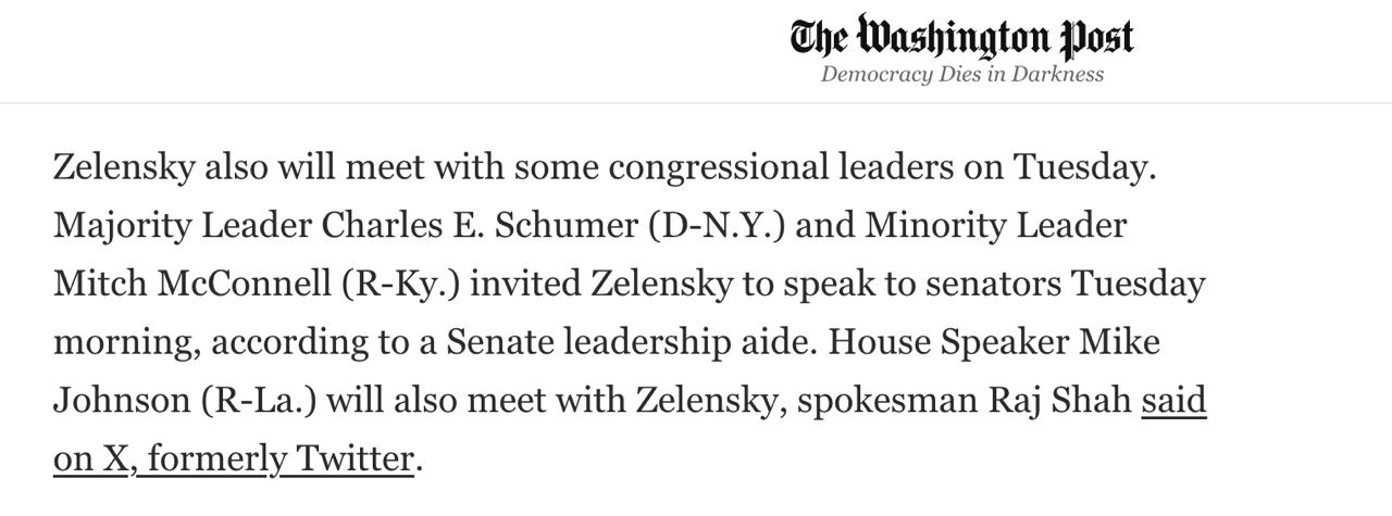 Также у него запланирована встреча со спикером Палаты представителей Майком Джонсоном. Но выступления в самой Палате пока нет в графике.