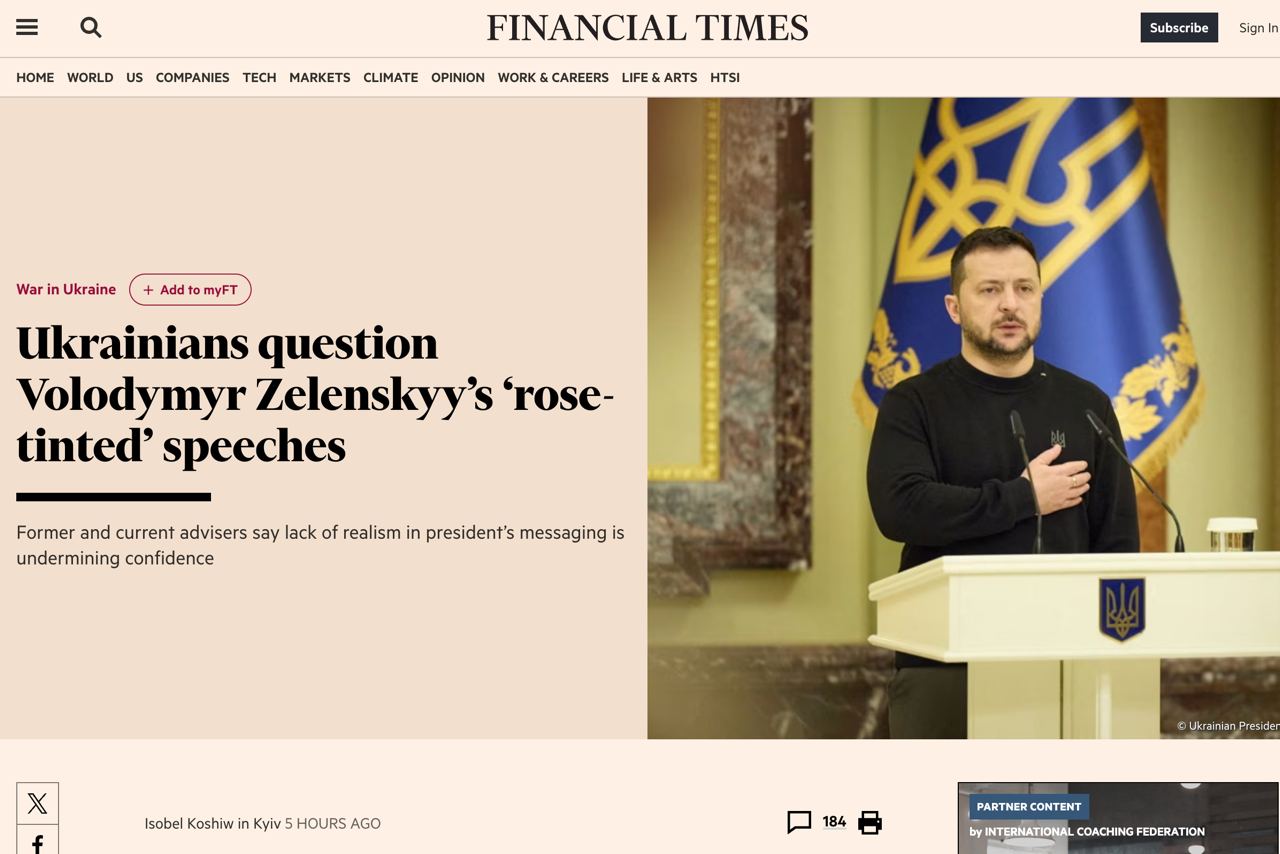 12.25 "Украинцы подвергают сомнению "розовые" речи Владимира Зеленского", - с таким заголовком вышла статья в Financial Times.