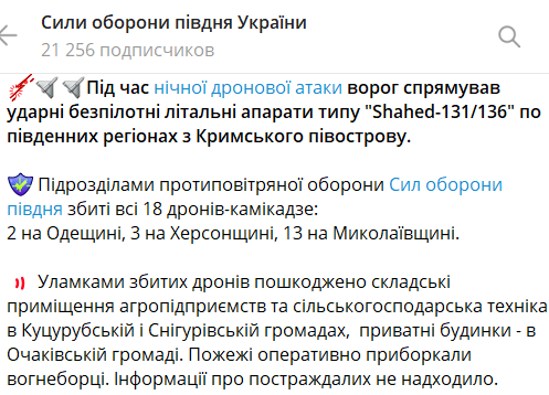 В Силах обороны юга добавили, что беспилотники запускались с территории временно оккупированного Крыма. Силы ПВО сбили 18 дронов: 13 - в Николаевской области, 3 - в Херсонской и 2 - в Одесской областях.