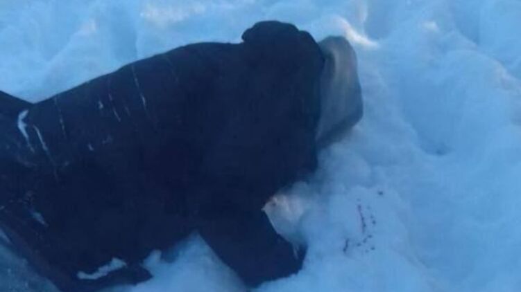 На фотографии тело на снегу лежит лицом вниз, рядом видны капли крови.