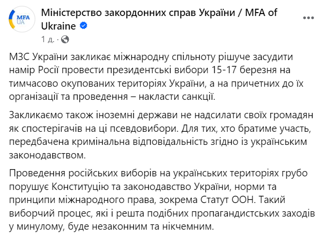 В ответ на это в МИД Украины заявили, что включение голосов, полученных на временно оккупированных территориях Украины, подвергнет сомнению легитимность всего результата выборов президента РФ.