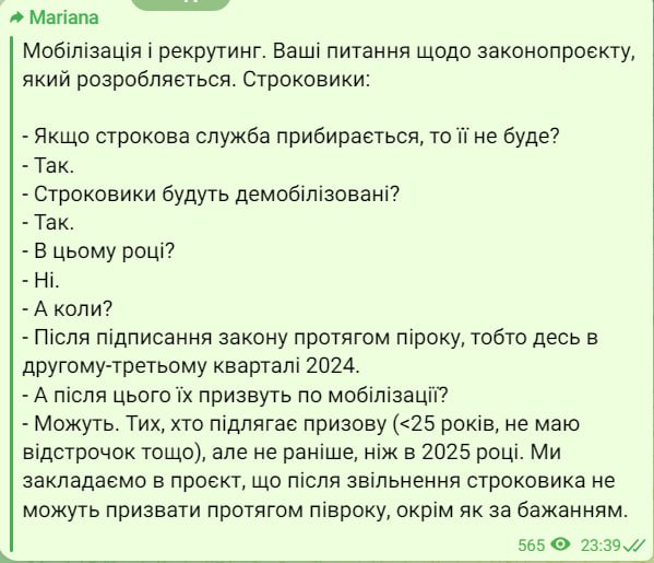 2. Демобилизация нынешних срочников, но не раньше апреля 2024 года (после подписания закона).