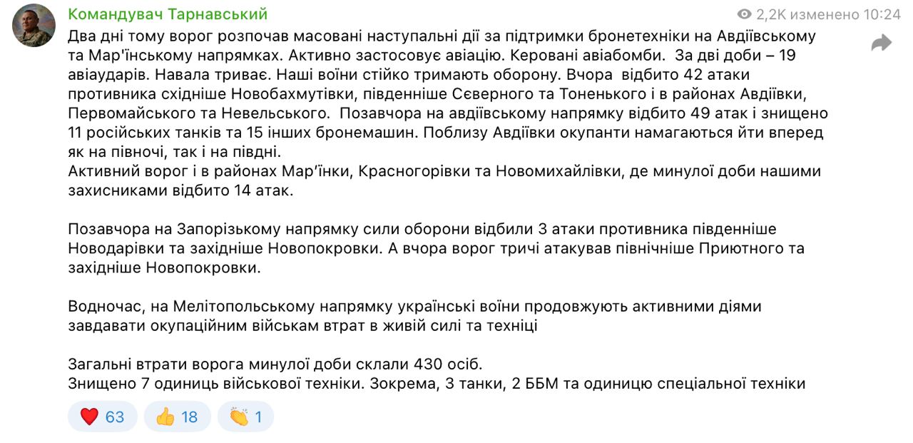 По его словам армия РФ атакует при поддержке бронетехники, активно применяет авиацию. ВСУ отбили десятки атак восточнее Новобахмутовки, южнее Северного и Тоненького, в районах Авдеевки, Первомайского и Невельского, Марьинки, Красногоровки и Новомихайловки.