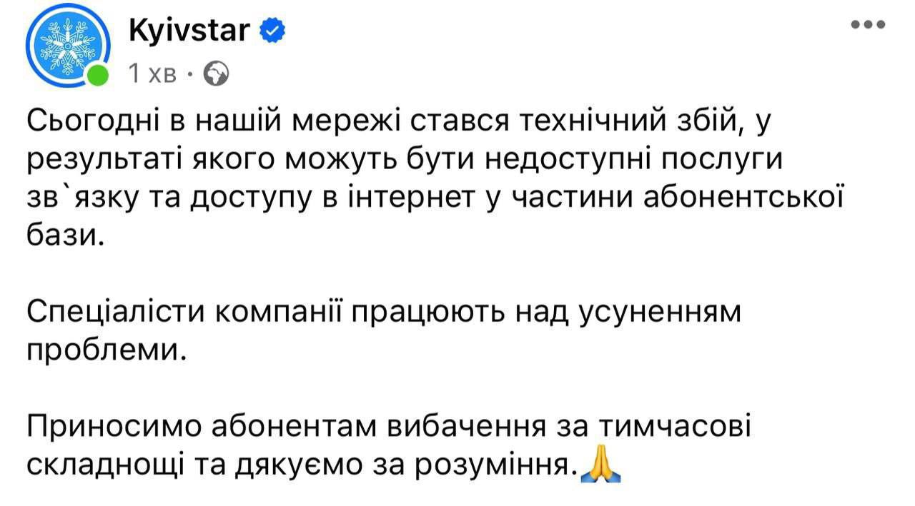 Вскоре в "Киевстаре" подтвердили техническую проблему (но не обыски) и сообщили, что в результате сбоя у части абонентов могут быть недоступны услуги связи и доступа в интернет.