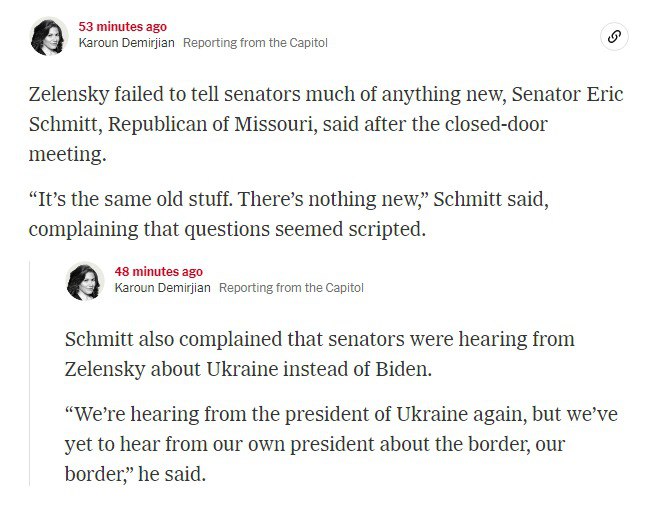 А сенатор-республиканец от штата Миссури Эрик Шмитт прокомментировал, что Зеленский не рассказал на встрече с сенаторами и спикером палаты представителей США ничего нового.