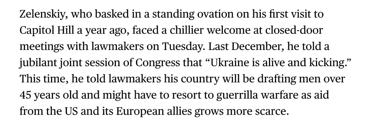 "Зеленский, который наслаждался овациями во время своего первого визита на Капитолийский холм год назад, встретил более прохладный прием на закрытых встречах с законодателями во вторник. В декабре прошлого года он заявил на ликующем совместном заседании Конгресса, что "Украина жива и здорова".