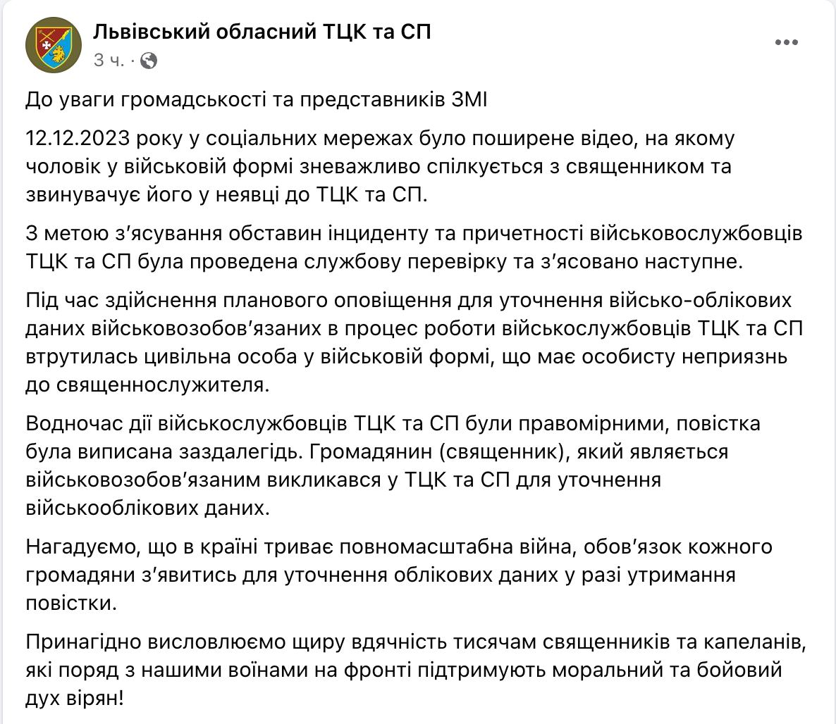 ТЦК заявляет, что действия его сотрудников были правомерными: повестка была выписана заранее, священник является военнообязанным и вызывался в ТЦК для уточнения военно-учетных данных.
