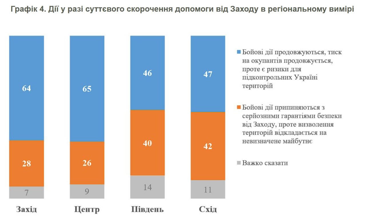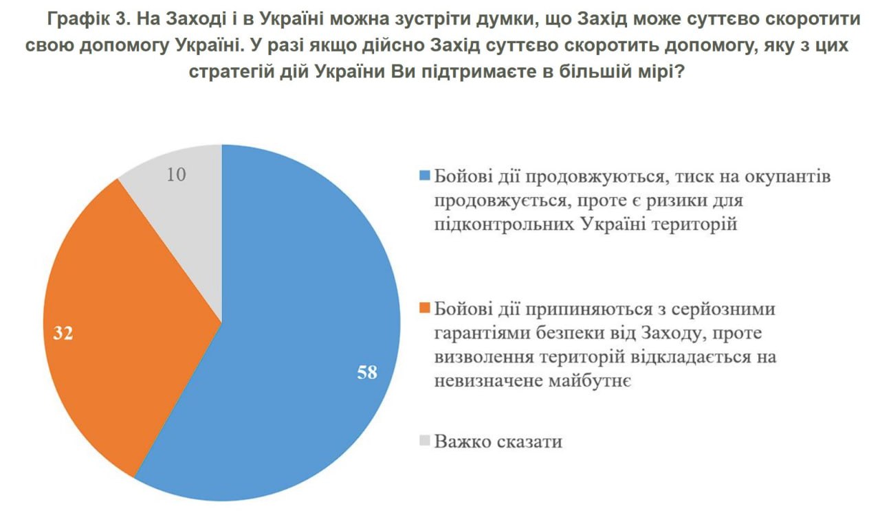 При этом большинство опрошенных украинцев  - 58% - высказались за продолжение войны, даже если Запад существенно сократит поддержку Украины, и есть риск потерять новые территории.