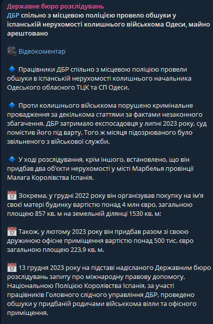 "Установлено, что он приобрел два объекта недвижимости в городе Марбелья провинции Малага Королевства Испания. В частности, в декабре 2022 года он организовал покупку на имя своей матери дома стоимостью более 4 млн. евро, общей площадью 857 кв. м на земельном участке 1530 кв. м. Также, в феврале 2023 г. он приобрел вместе со своей женой офисное помещение стоимостью более 500 тыс. евро общей площадью 223,9 кв. м." - сообщает ГБР.