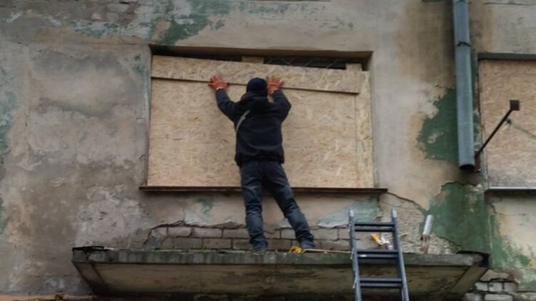 Глава Херсонской городской военной администрации Роман Мрочко опубликовал фото работ по заделыванию окон многоэтажек листами ДВП (древесноволокнистыми плитами).