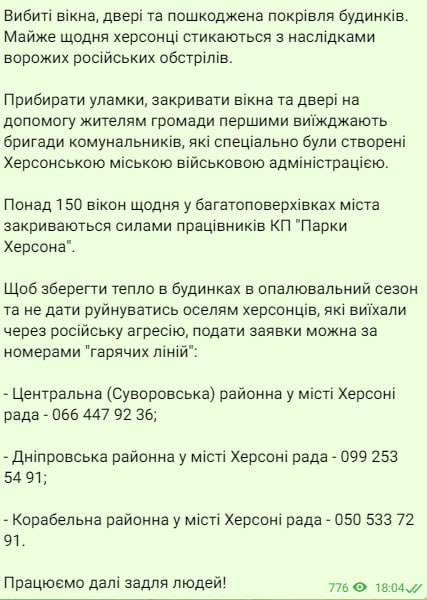 По его словам, почти каждый день херсонцы сталкиваются с последствиями российских обстрелов, в результате чего значительная часть домов остается без окон.