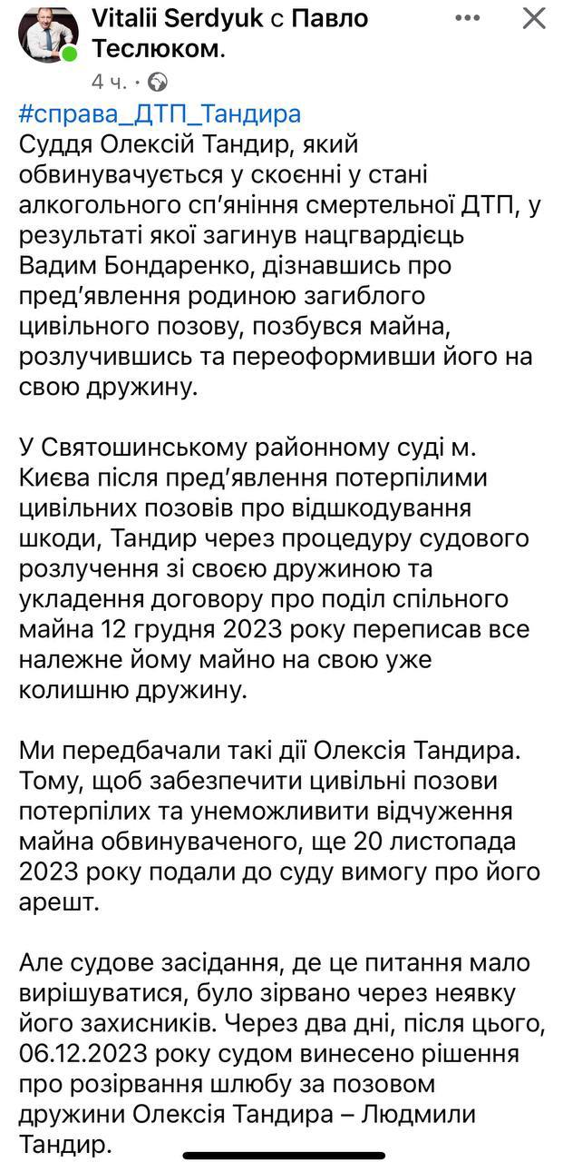 Киевский судья Алексей Тандыр, сбивший насмерть нацгвардейца Вадима Бондаренко, переоформил свое имущество на жену и развелся с ней, чтоб избежать ареста имущества.
