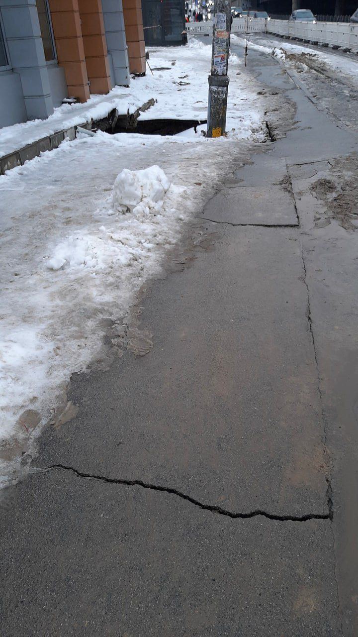 Паблик также разместил фотографии от 16 декабря, сделанные очевидцами. На них видны трещины и ямы в асфальте, а также покосившиеся магазины.