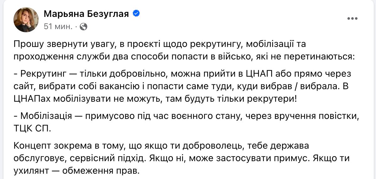 Она пишет, что в готовящемся законопроекте об усилении призыва есть два способа попасть в армию: добровольно через рекрутинг, что позволяет выбрать себе специализацию и место службы, а также принудительно - через повестку.