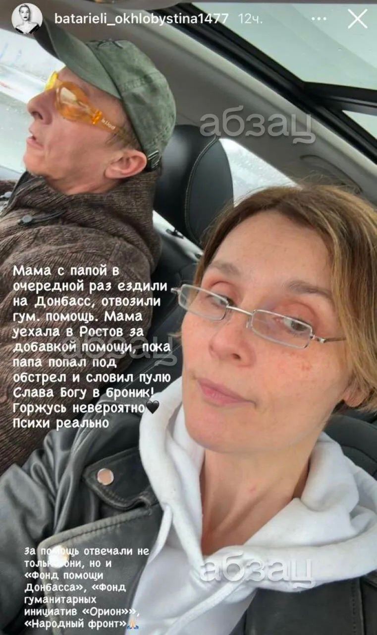 "Мама с папой в очередной раз ездили на Донбасс, отвозили гумпомощь. Мама уехала в Ростов за добавкой помощи, пока папа попал под обстрел и словил пулю. Слава Богу, в броник! Горжусь невероятно, психи реально", - написала Евдокия.