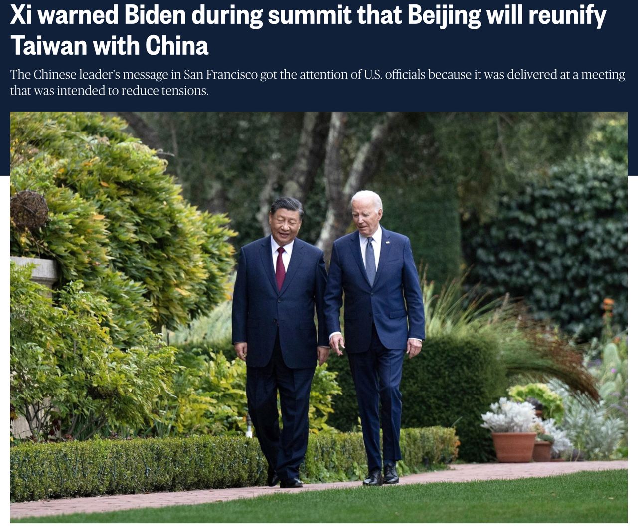 Председатель КНР Си Цзиньпин прямо заявил президенту США Джо Байдену на их недавней встрече в Сан-Франциско, что Китай воссоединится с Тайванем, но "мирным путем, а не силой".