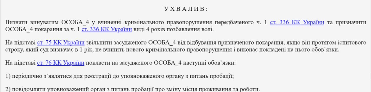 Суд признал мужчину виновным по ч.1 ст. 336 УК Украины и приговорил к 4 годам лишения свободы, заменив на 1 год испытательного срока. Мужчина же свою вину не признал.