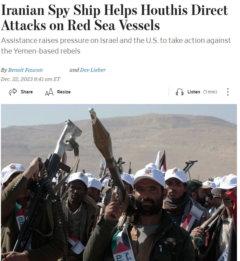 "Иранские военизированные формирования предоставляют в реальном времени разведывательные данные йеменским хуситам, их повстанцы используют для наведения дронов и ракет, чтобы атаковать суда, проходящие через Красное море", - говорится в публикации.