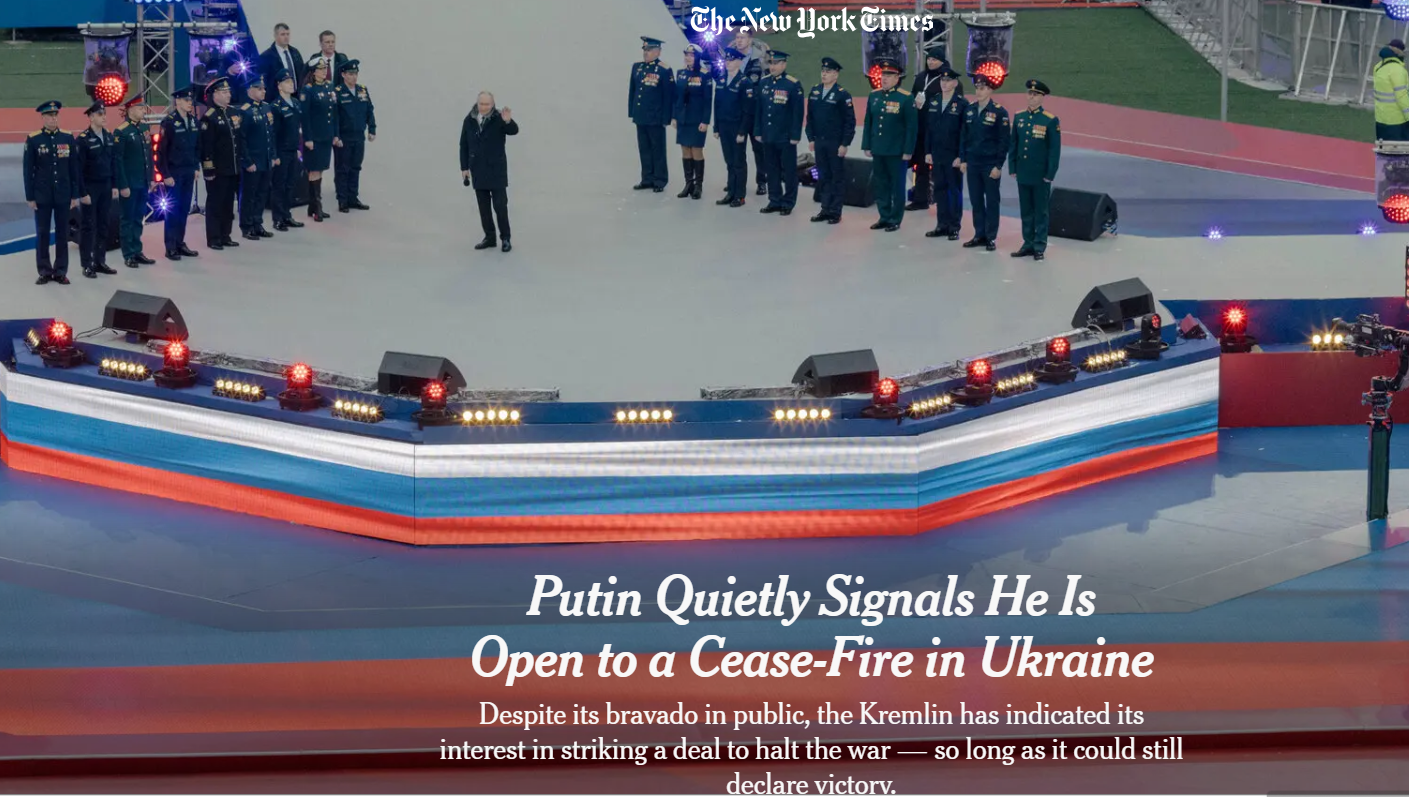 Об этом The New York Times рассказали американские чиновники и бывшие российские чиновники, близкие к Кремлю. По их словам, Путин с сентября намекает на готовность к перемирию, которое останавливает бои на текущих позициях.