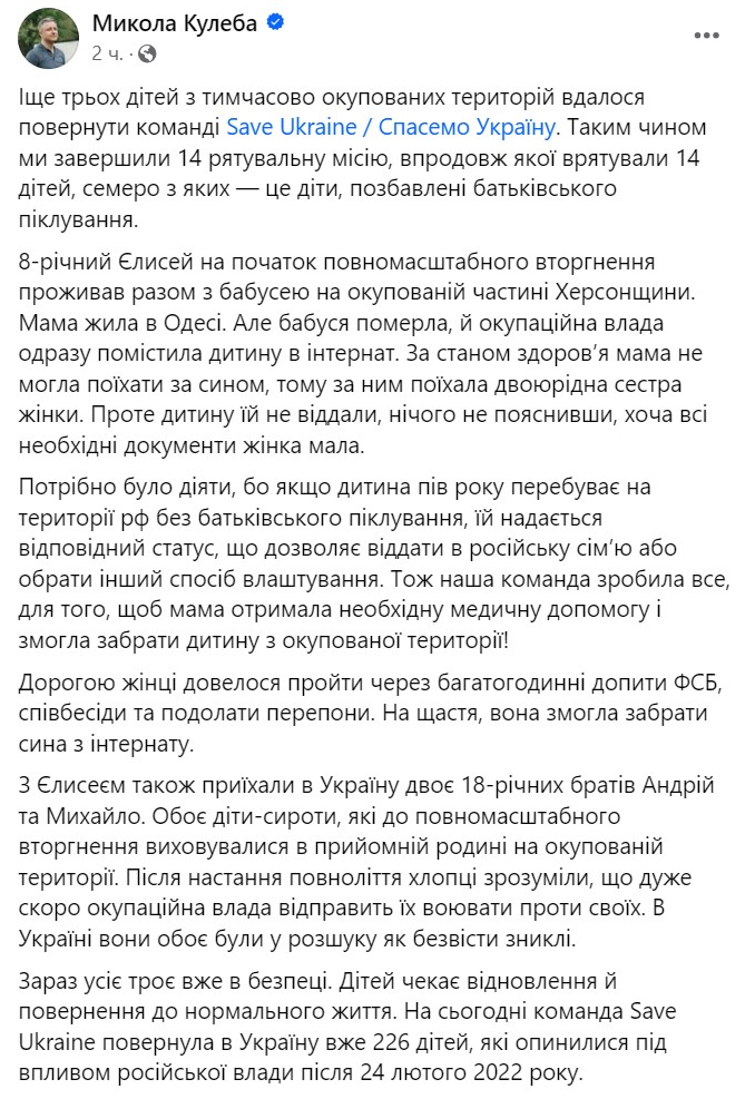 Кулеба рассказал, что это была 14 спасательная миссия организации благодаря, которой удалось вернуть домой 14 детей. Семеро из них были лишены родительской опеки.