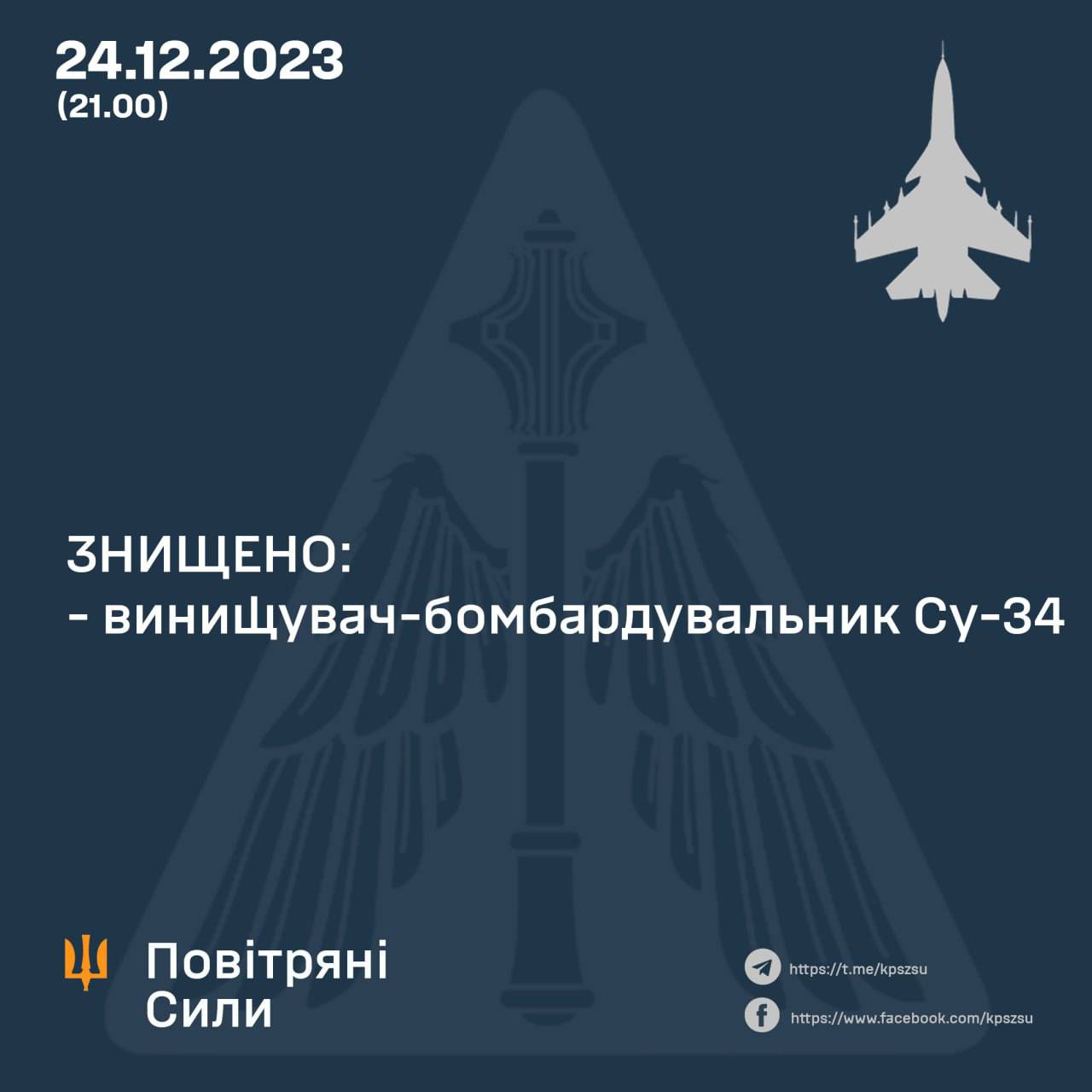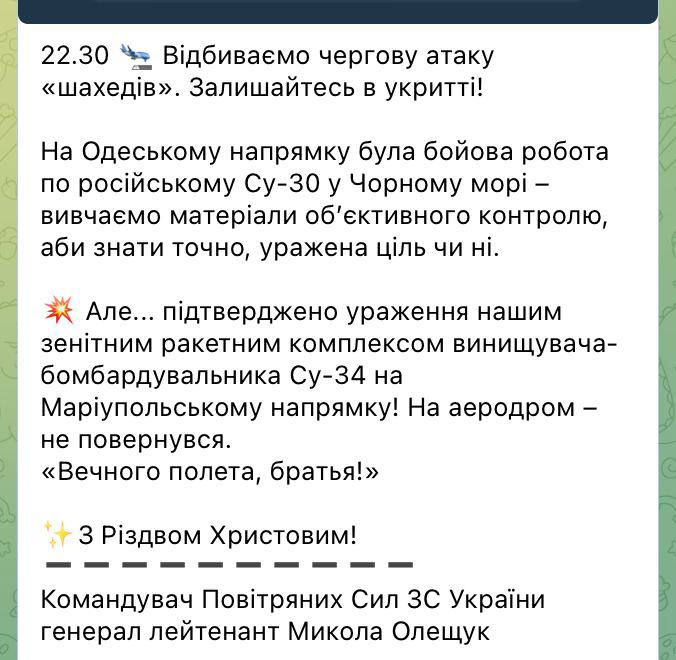 "Подтверждено поражение нашим зенитным ракетным комплексом истребителя-бомбардировщика Су-34 на Мариупольском направлении. На аэродром – не вернулся", - говорится в сообщении командующего ВС ВСУ.