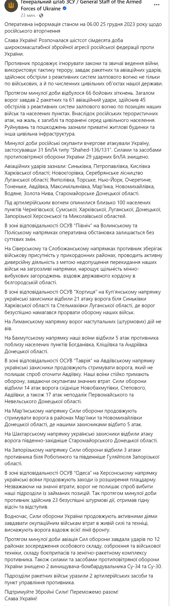 Война в Украине идет уже 670-й день. Мы следим за последними новостями и ключевыми событиями 25 декабря 2023 года в обновляемом онлайне.