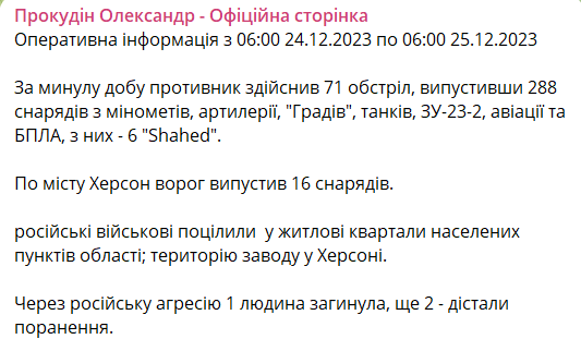 За минувшие сутки россияне совершили 71 обстрел, выпустив 288 снарядов из минометов, артиллерии, "Градов", танков, ЗУ-23-2, авиации и БПЛА, из них - 6 "Shahed". По городу Херсон враг выпустил 16 снарядов.