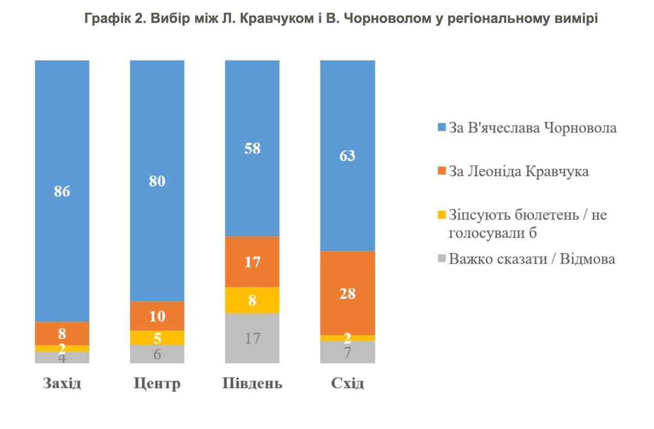 Наибольшая поддержка у Черновола была бы на Западной Украине - 86%, наименьшая на юге - 58%.