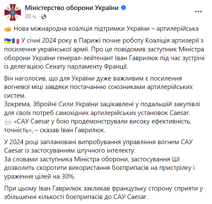 Заместитель министра обороны Украины генерал-лейтенант Иван Гаврилюк в ходе встречи с делегацией Сената парламента Франции сообщил, что для Украины очень важно усиление огневой мощи благодаря поставке союзниками артиллерийских систем.