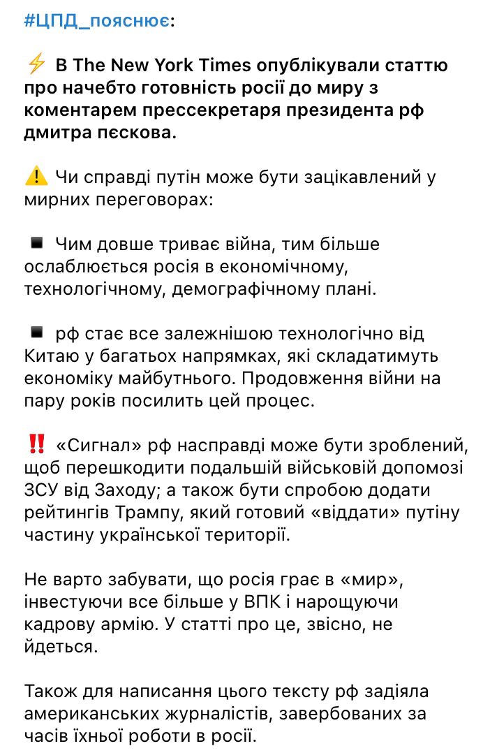 Центр противодействия дезинформации при СНБО заявляет, что журналисты газеты The New York Times, написавшие статью о готовности России к переговорам, являются агентами Кремля.