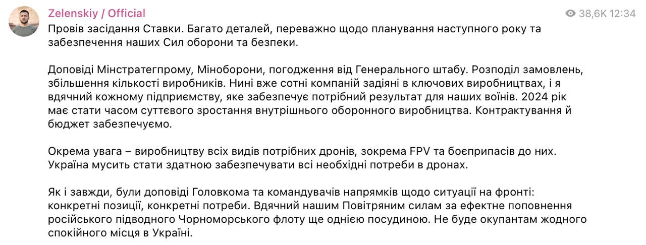 "Много деталей, главным образом относительно планирования следующего года и обеспечения наших сил обороны и безопасности. Доклады Минстратегпрома, Минобороны, согласования от Генерального штаба. Распределение заказов, увеличение количества производителей", - говорится в сообщении